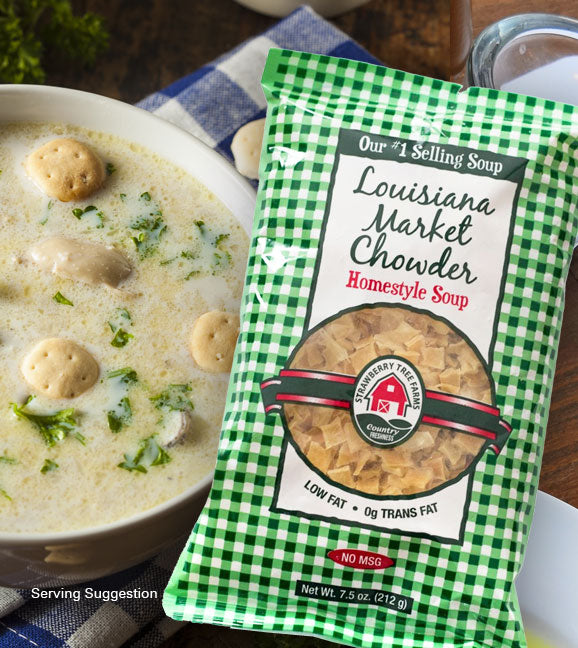Louisiana Market Chowder is a hearty dry soup mix that is extraordinarily versatile and our number one best seller! Just add corn, chicken, clams, shrimp, fish, or anything else you can imagine. The authentic taste brings the French Quarter right to your soup bowl.